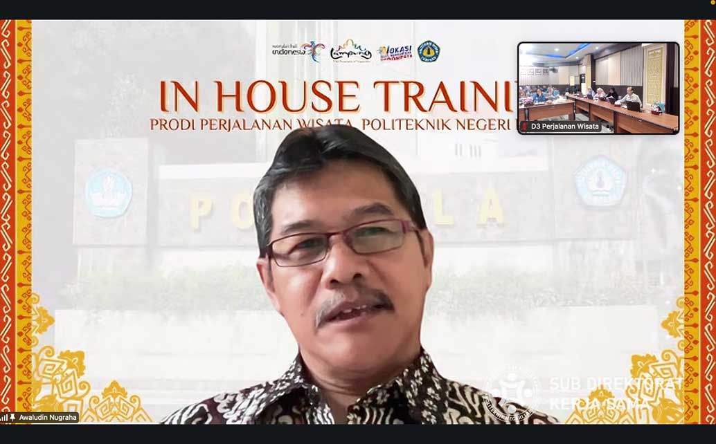 Polinela, Rabu (23/10/2024). Program Studi Perjalanan Wisata, Politeknik Negeri Lampung (Polinela), gelar In House Training bertema “Strategi Penulisan Penelitian, Pengabdian kepada Masyarakat, dan Publikasi Ilmiah bagi Akademisi Kepariwisataan”. Kegiatan bertujuan untuk memperkuat kapasitas dosen dan akademisi di lingkungan kepariwisataan dalam melakukan penelitian dan pengabdian kepada masyarakat, sekaligus meningkatkan kemampuan publikasi ilmiah.