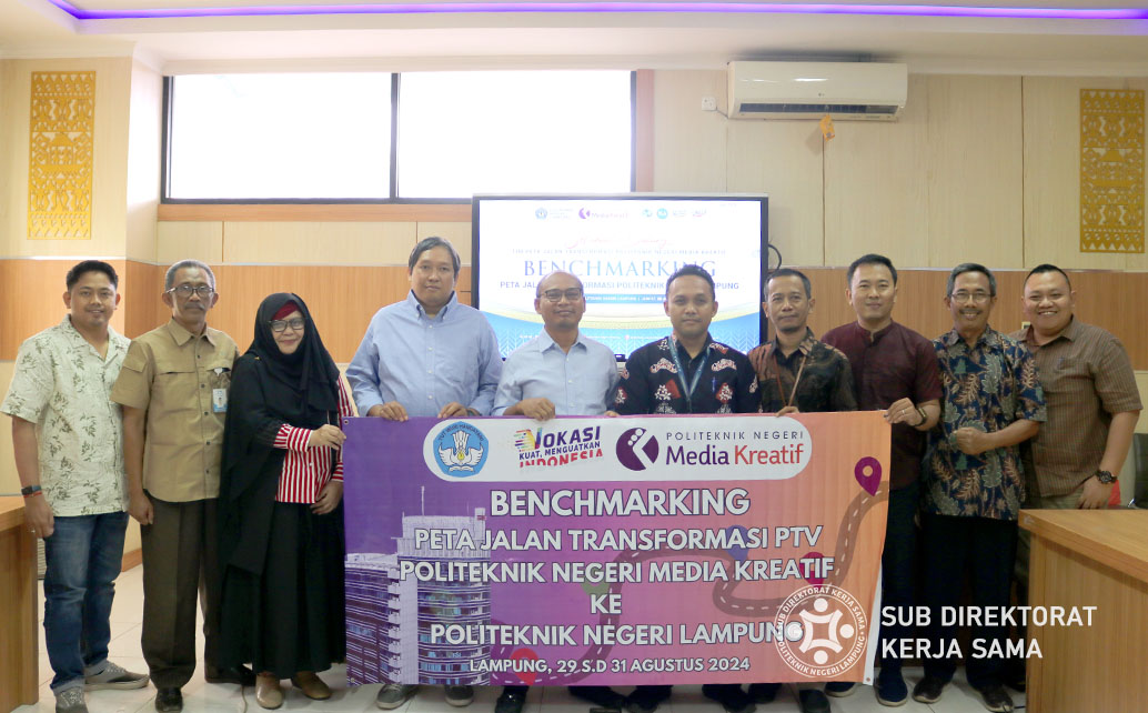 Polinela, Kamis (05/09/2024). Politeknik Negeri Lampung (Polinela) menerima kunjungan dari Politeknik Negeri Media Kreatif (Polimedia Kreatif) dalam rangka memperluas wawasan dan berbagi pengetahuan mengenai Benchmarking Peta Jalan Transformasi. Kunjungan ini bertujuan untuk memperkuat kolaborasi antar kedua institusi dalam mengembangkan program transformasi pendidikan vokasi.