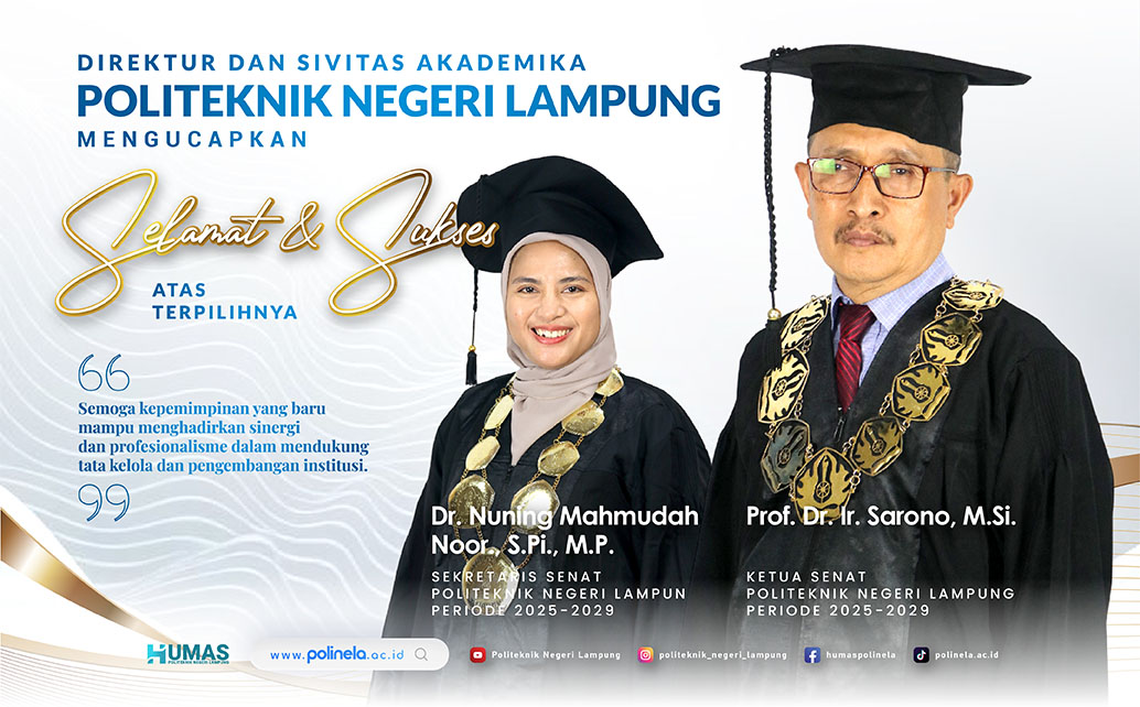 Polinela, Rabu (24/12/2025). Prof. Dr. Ir. Sarono, M.Si. terpilih sebagai Ketua Senat Politeknik Negeri Lampung Periode 2025 – 2029. Bersama Dr. Nuning Mahmudah Noor, S.Pi., M.P. sebagai Sekretaris Senat siap menjadi momentum penting dalam memperkuat tata kelola kelembagaan di lingkungan Polinela.