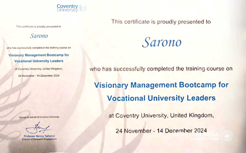 Direktur Politeknik Negeri Lampung (Polinela), Prof. Dr. Ir. Sarono, M.Si., berhasil menyelesaikan kursus pelatihan Bootcamp Manajemen Visioner untuk Pimpinan Universitas Vokasi yang dilaksanakan di Coventry University, Inggris.