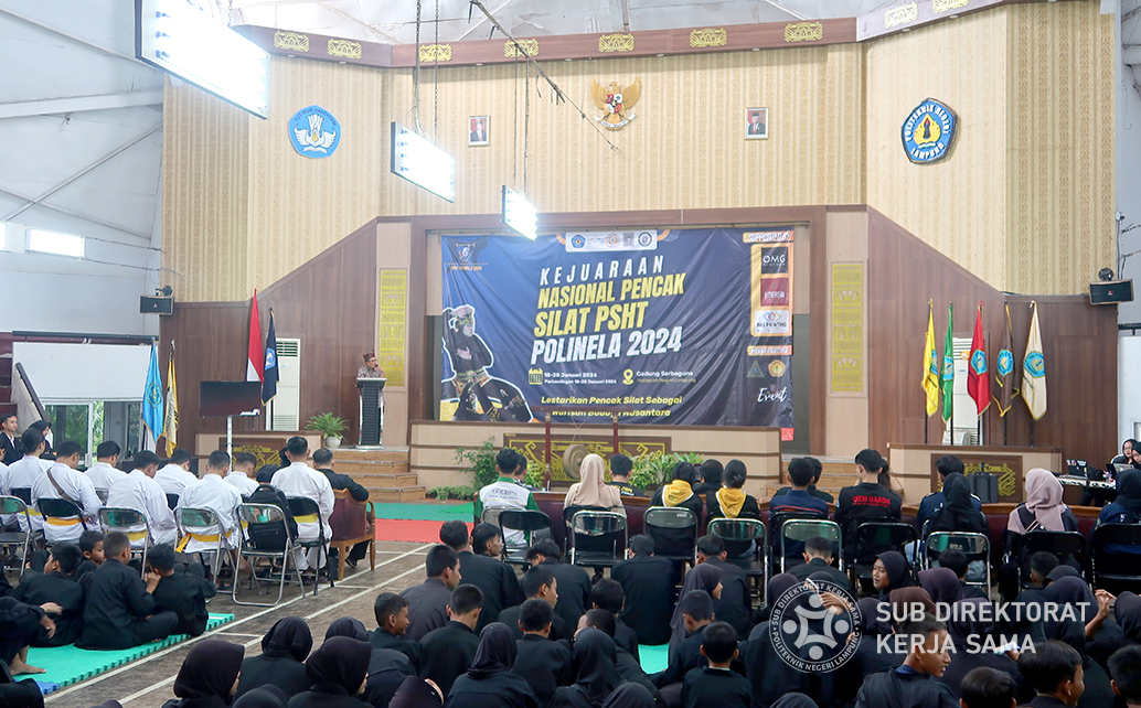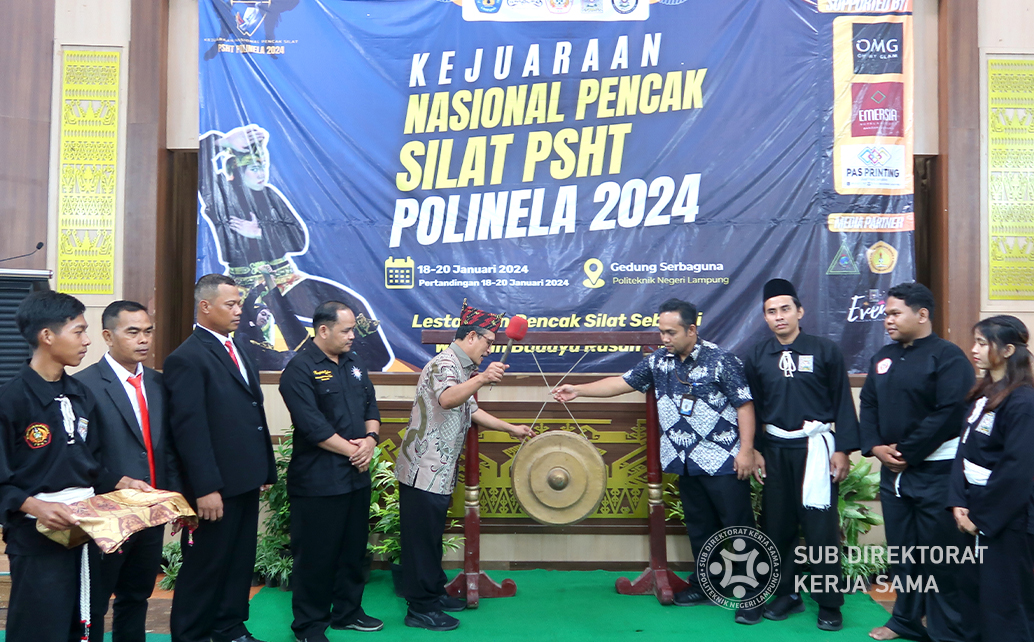Polinela, Kamis (18/01/2023). Politeknik Negeri Lampung (Polinela) menjadi tuan rumah dalam Kejuaraan Nasional Pencak Silat Polinela Tahun 2024 yang bertema “Lestarikan Pencak Silat sebagai Warisan Budaya Nusantara.” Kegiatan diselenggarakan oleh Persaudaraan Setia Hati Terate (PSHT) Komisariat Polinela. berlangsung di Gedung Serba Guna Polinela, pada Kamis hingga Sabtu, 18-20 Januari 2024.