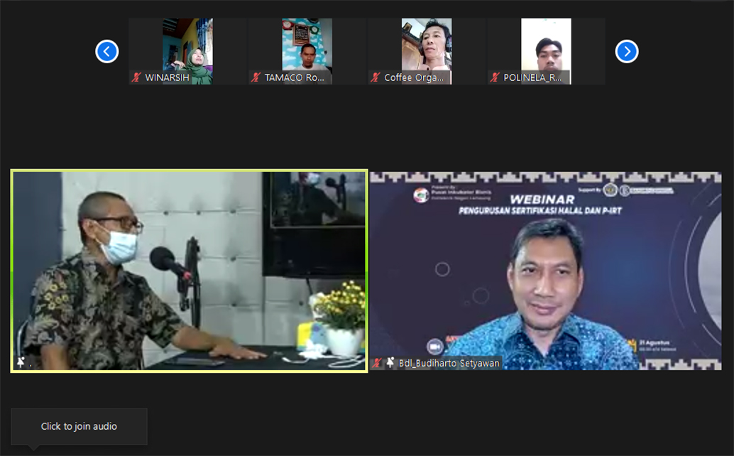 Polinela, Sabtu (21/08/2021). Dalam rangka mendukung pengembangan Ekonomi Syariah khususnya UMKM, sertifikasi produk pangan industri rumah tangga Pusat Inkubator Bisnis Polinela bekerjasama dengan KPw Bank Indonesia Provinsi Lampung Mengadakan Webinar Pengurusan Sertifikasi Halal dan P-IRT. Kegiatan dilaksanakan secaa virtual pada hari Sabtu, 21 Agustus 2021. Kepala Pusat Ibkubator Bisnis Polinela Ir. Bambang Utoyo, M.P. menjelaskan bahwa kegiatan ini merupakan rangkaian program Pengembangan Ekonomi Syariah di Povinsi Lampung oleh Bank Indonesia. Narasumber kegiatan webinar ini adalah