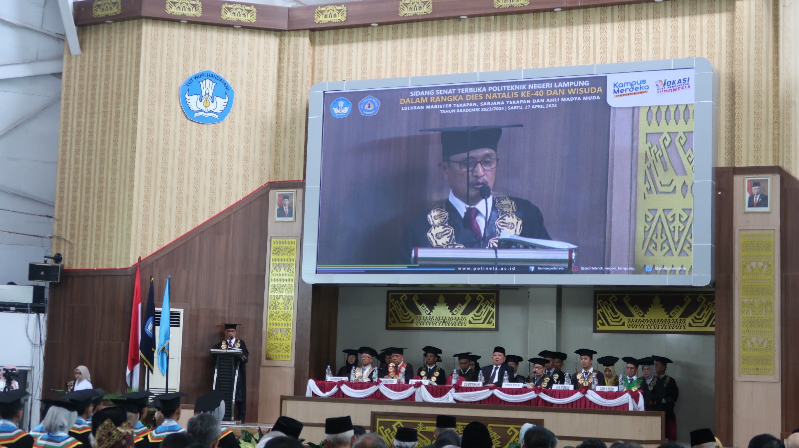 Polinela, Senin (29/04/2024). Politeknik Negeri Lampung (Polinela) merayakan Dies Natalis ke-40 dengan menggelar Sidang Terbuka Senat dan Wisuda lulusan Magister Terapan, Sarjana Terapan, dan Ahli Madya Polinela yang berlangsung pada Sabtu, 27 April 2024, di Gedung Serba Guna (GSG). Kegiatan dibuka oleh Ketua Senat Polinela, Ir. Zainal Mutaqin, M.Si.