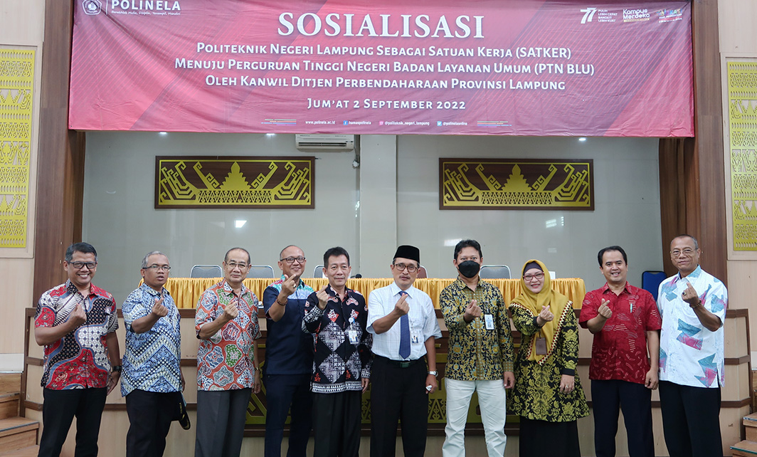 Polinela, Jum’at (02/09/2022). Sosialisasi Politeknik Negeri Lampung sebagai Satker (Satuan Kerja) menuju Perguruan Tinggi Negeri Badan Layanan Umum (PTN BLU), bertempat Gedung Serba Guna Polinela pada Jum’at, 2 September 2022.