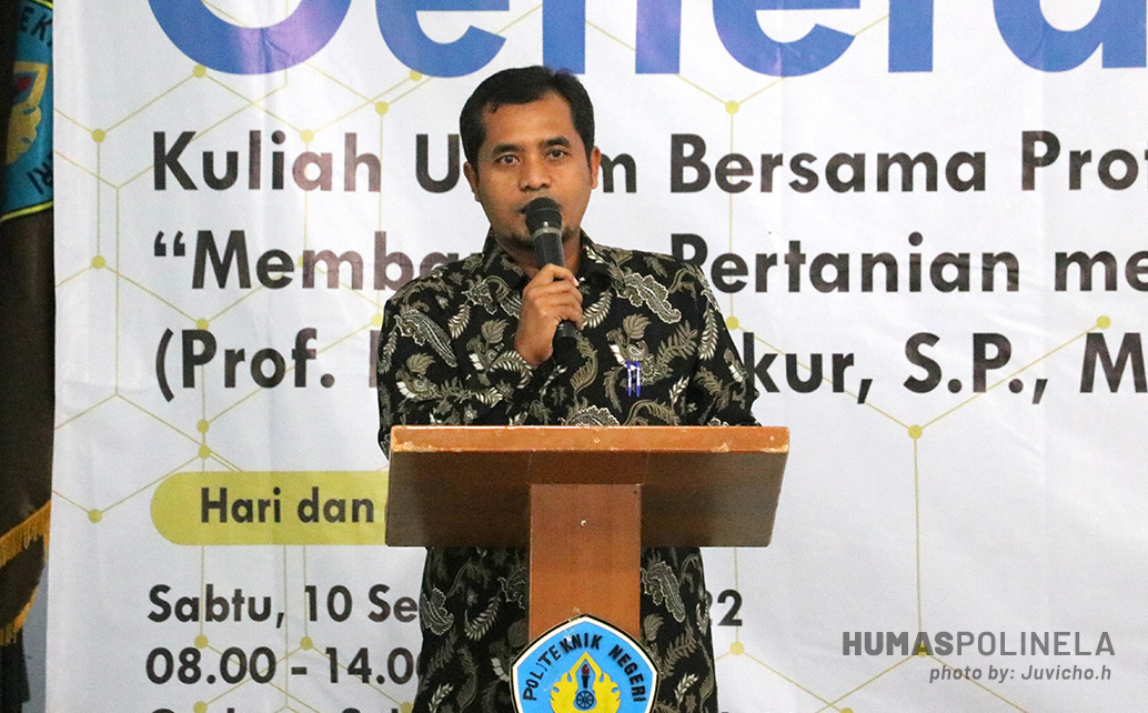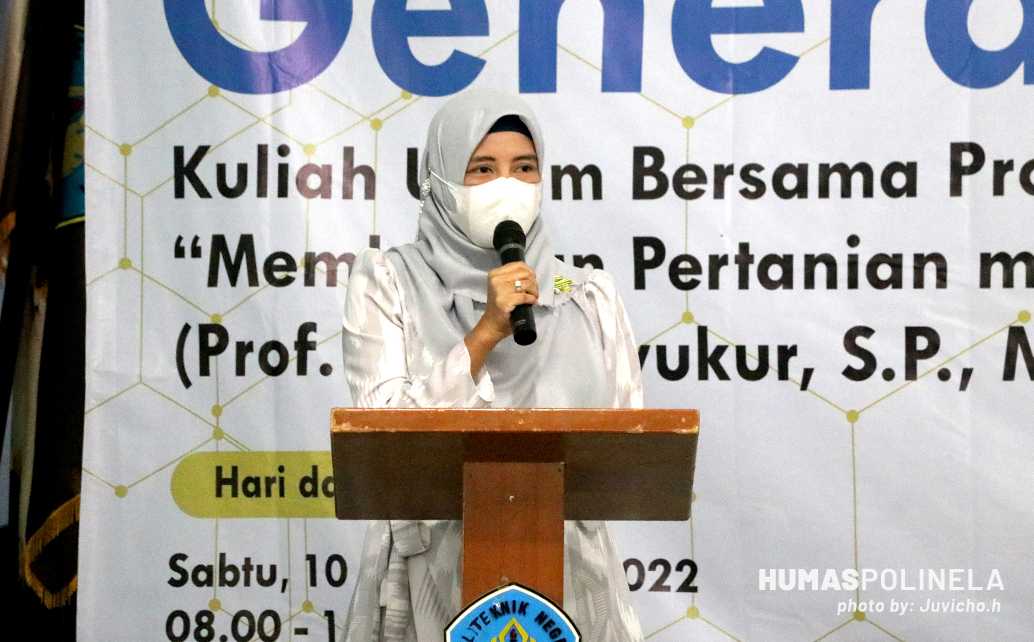 Dilanjutkan sambutan oleh Ketua Jurusan Budidaya Tanaman Pangan,  Desi Maulida, S.P., M.Si., beliau menyampaikan “dengan dilaksanakannya Stadium General sekaligus penandatanganan MoU dengan 5 industri, kita sebagai lembaga Pendidikan Vokasi yang diharuskan link and Match  dengan Industri, Dunia Usaha, Dunia Kerja (DUDIKA), maka kami berharap kepada bapak/ibu menjadikan kegiatan ini bukan hanya sebatas kegiatan praktek kerja lapangan tetapi juga bisa kegiatan lainnya yaitu terkait dengan riset dan pengabdian antara industri dengan perguruan tinggi khususnya diprogram studi Teknologi Perbenihan. Kemudian bagi adik-adik mahasiswa, hari ini kita kedatangan Prof. Dr. Muhammad Syukur,S.P., M.Si., beliau adalah seorang peneliti  yang karyanya sudah banyak dipublikasikan dalam bentuk  buku, dan bukunya tersedia di toko-toko buku salah satunya  gramedia. Karya tulis beliau  selama ini menjadi referensi kita untuk melaksanakan kegiatan perkuliahan pada Program Studi Teknologi Perbenihan,  jadi pada kegiatan ini, ibu berpesan kepada adik-adik mahasiswa untuk bisa mengambil ilmunya, bertanya sebanyak mungkin karena beliau dan tim sudah meluangkan waktu pada hari ini untuk memberikan ilmu kepada adik-adik semuanya”.