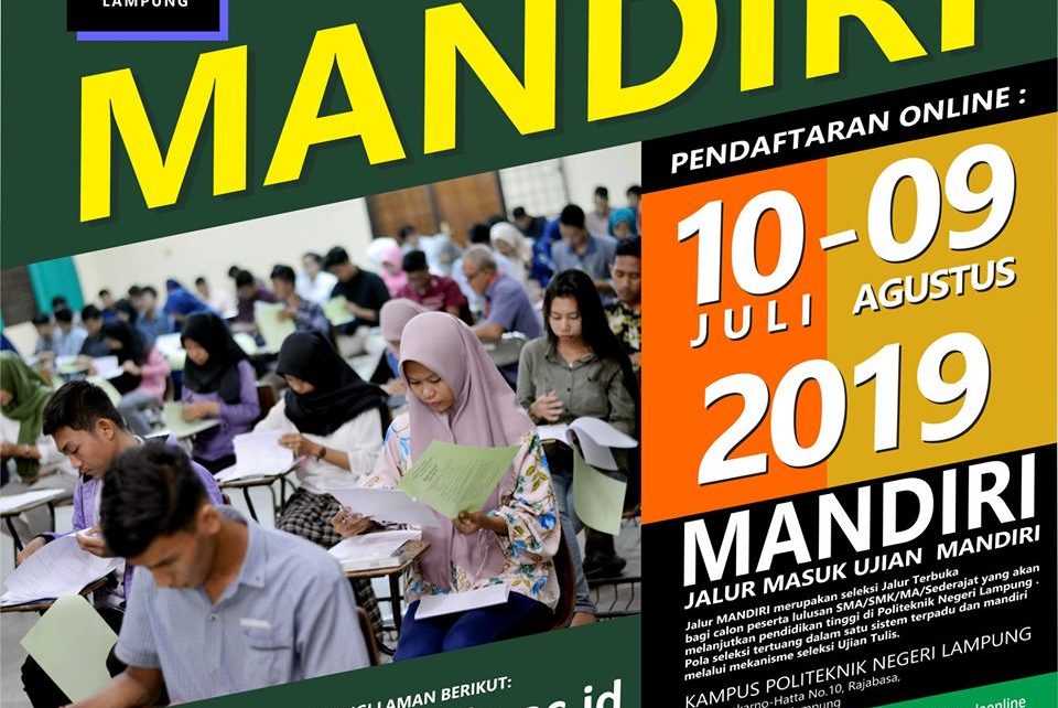 Rabu (10/7/2019). Jalur Ujian Mandiri merupakan seleksi Jalur Terbuka bagi calon peserta lulusan SMA/SMK/MA/Sederajat yang akan melanjutkan pendidikan tinggi di Politeknik Negeri Lampung. Pola seleksi tertuang dalam satu sistem terpadu dan mandiri melalui mekanisme seleksi Ujian Tulis. Berikut Program Studi yang ada di Politeknik Negeri Lampung. Pendaftaran online Jalur UM dimulai dari tanggal 10 Juli – 09 Agustus […]