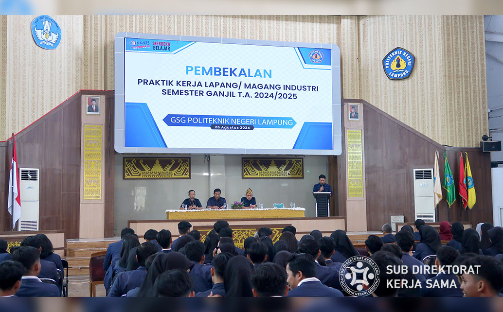Polinela, Selasa (26/08/2024). Politeknik Negeri Lampung (Polinela) menggelar Pembekalan Praktik Kerja Lapang (PKL) Semester Ganjil Tahun Akademik 2024/2025. Kegiatan diikuti oleh 656 mahasiswa dari 16 Program Studi yang akan menjalani PKL,