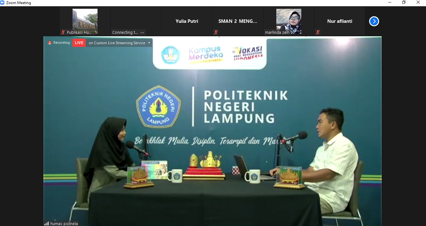 Polinela, Rabu (03/03/2021). Politeknik Negeri Lampung bersama Duta Kampus menyelenggarakan Talk Show via Zoom Meeting dan Live Streaming Youtube https://www.youtube.com/watch?v=rdHeeO1oU9Y. Acara dimoderatori oleh Ulil Fitria, Top 10 Duta Kampus Polinela 2020, dengan narasumber Dwi Puji Hartono, S.Pi., M.Si., selaku Pembantu Direktur I.