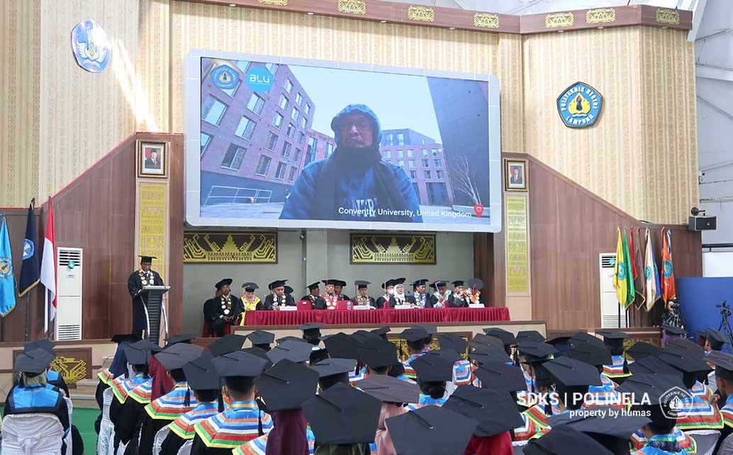 Direktur Polinela, Prof. Dr. Ir. Sarono, M.Si., dalam sambutannya melalui sambungan Video , menekankan pentingnya kontribusi lulusan dalam pembangunan bangsa. “Kami percaya lulusan Polinela mampu menjadi agen perubahan, baik di tingkat lokal, nasional, maupun internasional,” tegasnya.